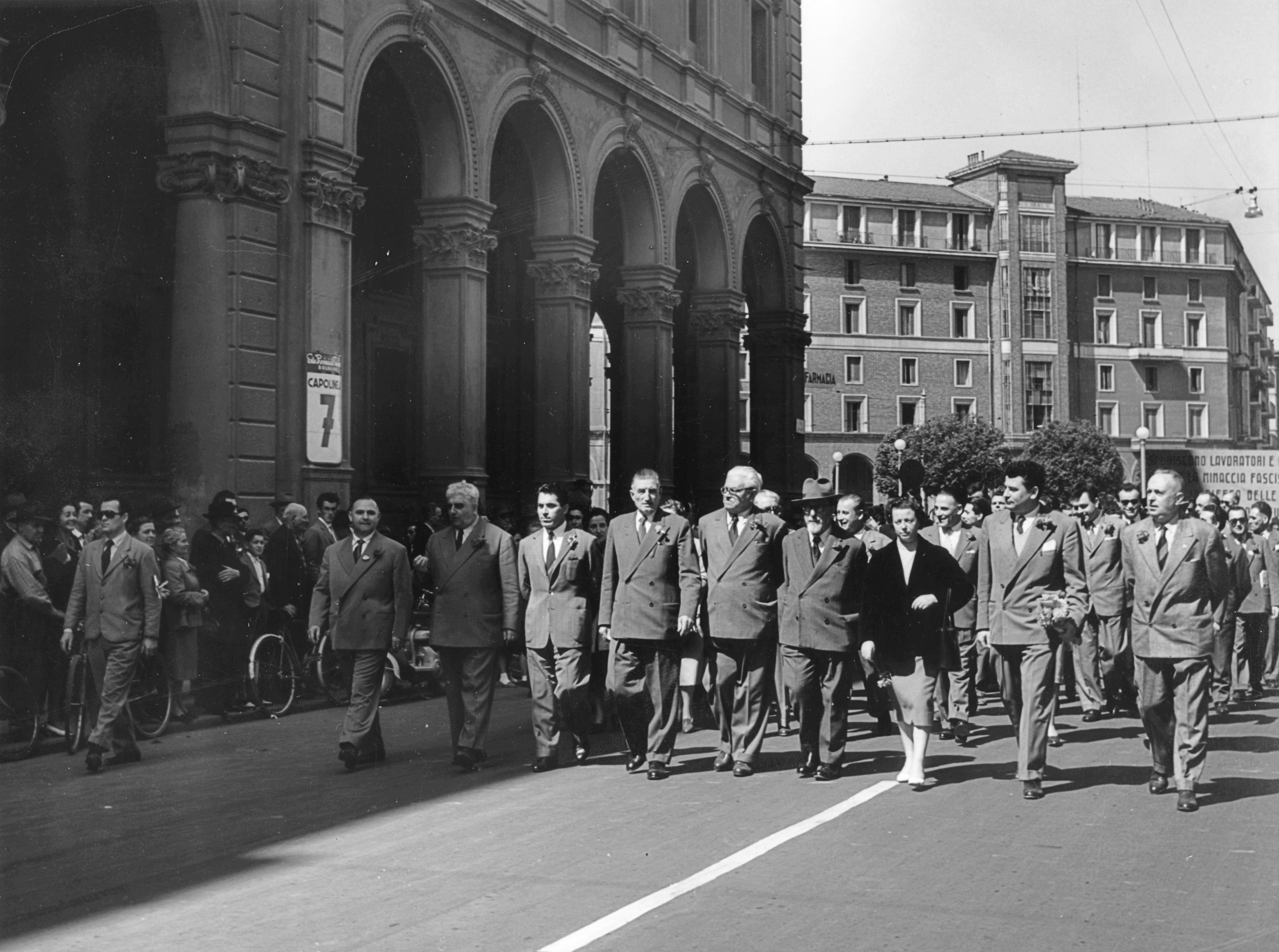 28. I Maggio 1955. Sfila la testa del corteo. Visibili da destra Umberto Romagnoli, Diana Sabbi, Anselmo Marabini, Clodoveo Bonazzi, Onorato Malaguti, Giuseppe Dozza.