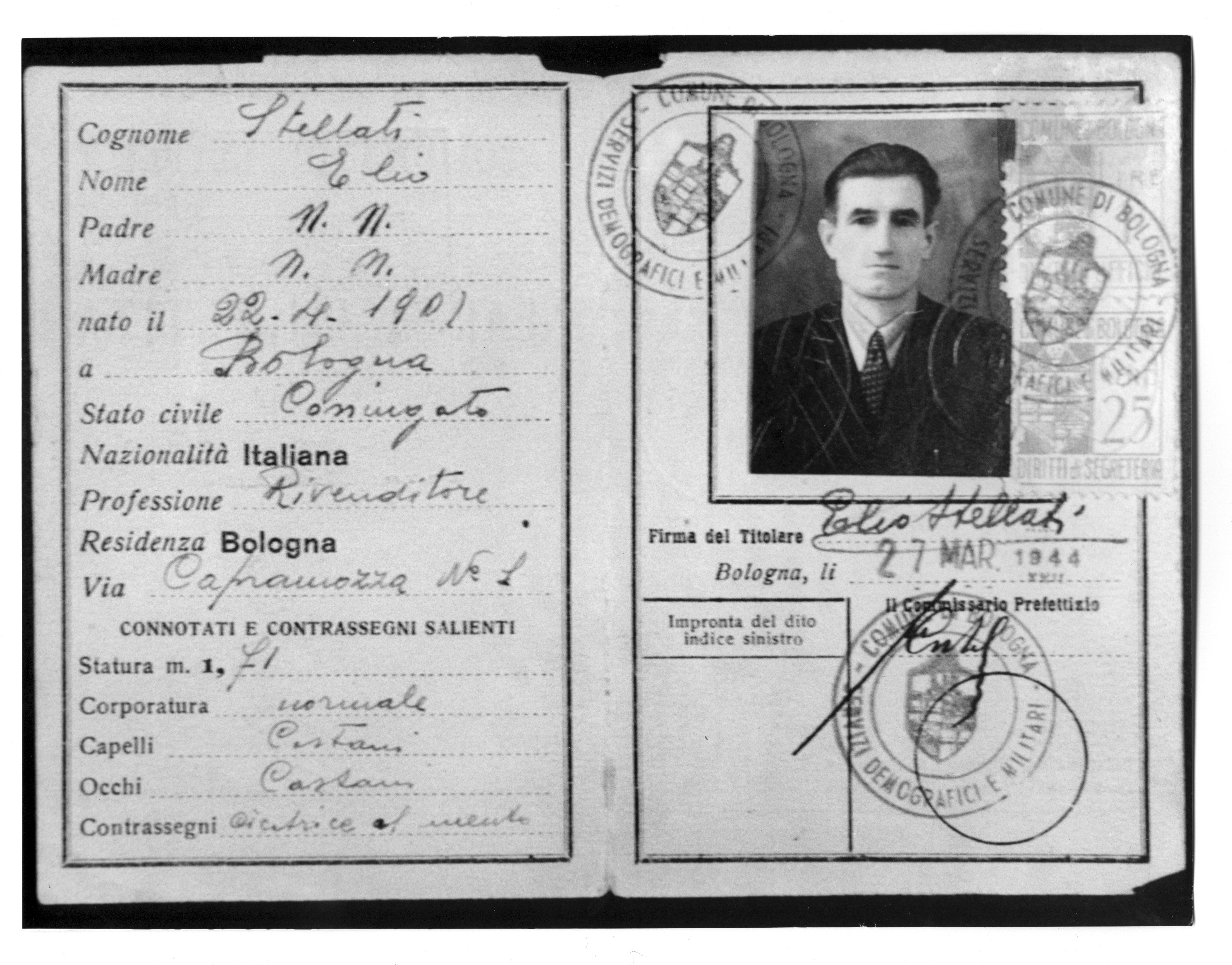 2. Fotocopia della carta di identità falsa (col nome di Elio Stellati) con cui Onorato Malaguti circolava nel 1944 per evitare l’arresto da parte dei nazifascisti.
