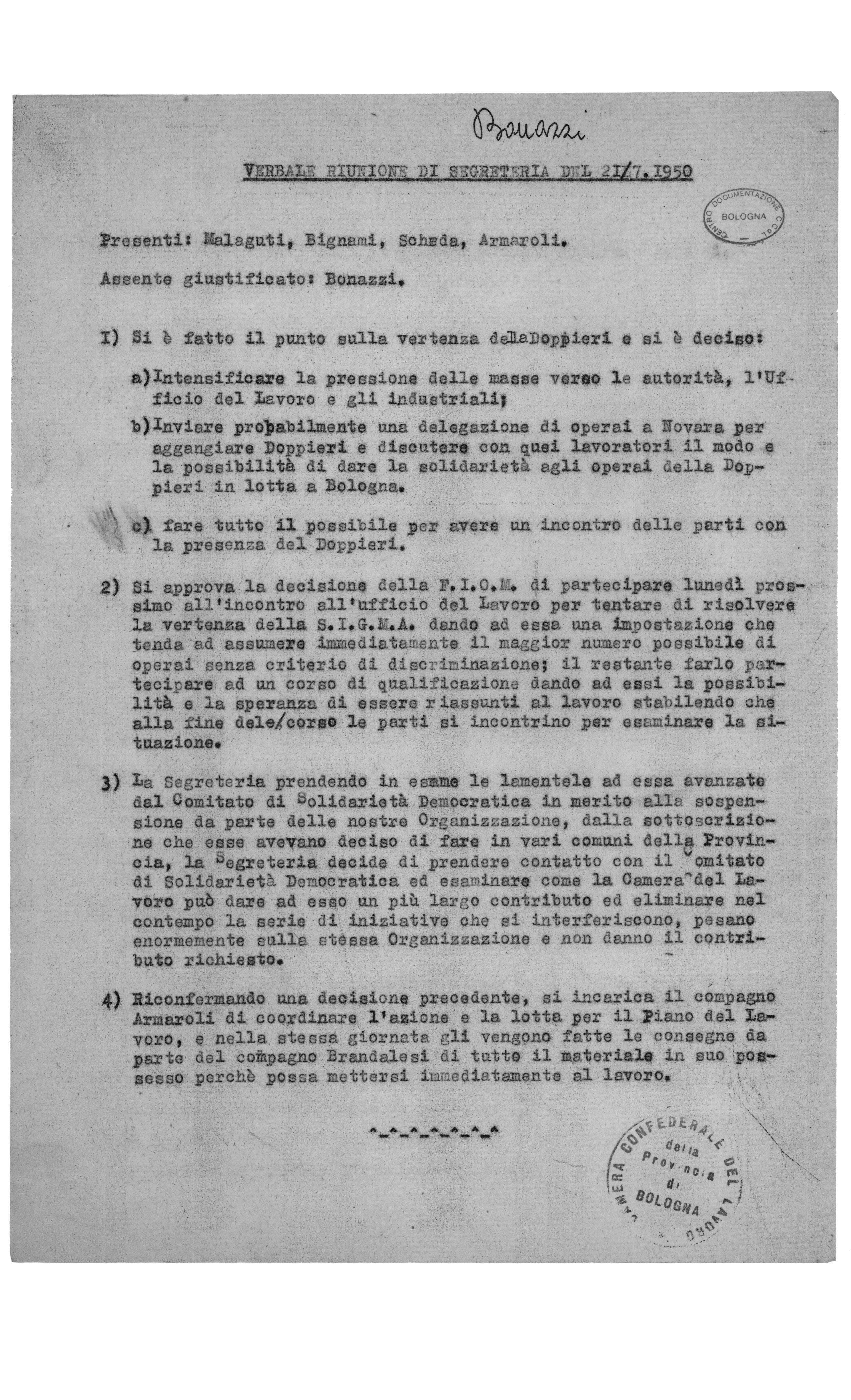 38. 21 luglio 1950. Verbale della Segreteria della C.d.L. provinciale sulla vertenza alla Doppieri di Bologna ed alla S.I.G.M.A. ; sui rapporti con il Comitato di Solidarietà Democratica, creato per sostenere i/le lavoratori/trici licenziati/e e detenuti/e per motivi sindacali e politici; sull’incarico ad Armaroli di coordinare le azioni per il Piano del lavoro.